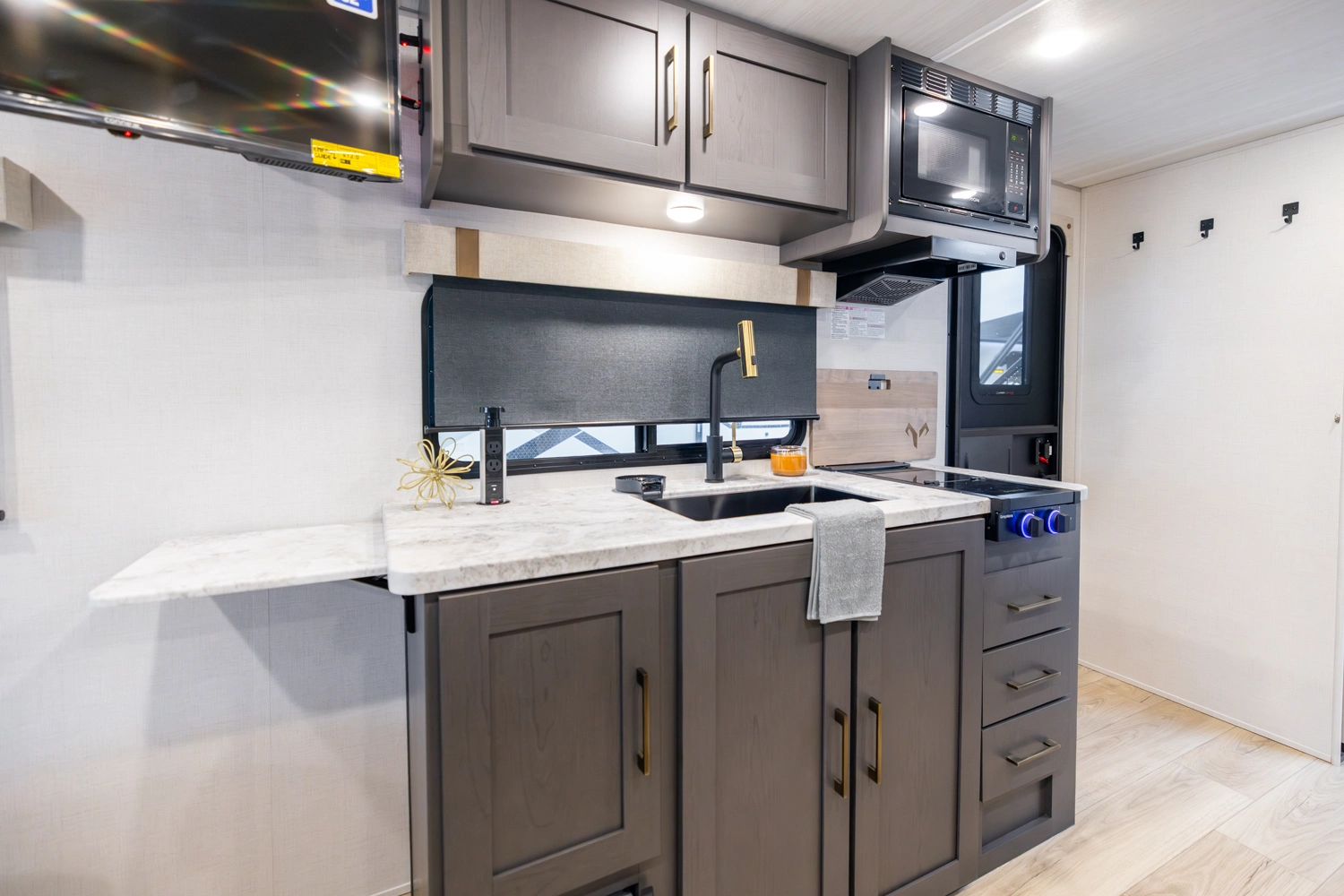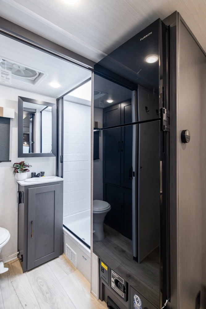 The 19QRB is a feature-rich, tow-friendly travel trailer that blends comfort, function, and durability. A front queen bed provides a cozy retreat with ample storage, while the central kitchen, complete with a large fridge and air fryer microwave to make meal prepping effortless. The slide-out sofa adds spacious comfort for relaxing or entertaining, and the rear bath features an upgraded shower and high-power fan. Built for extended-season use, the 19QRB is ready for adventure.